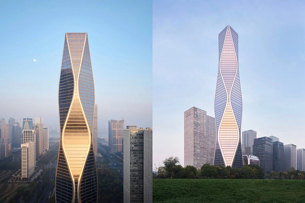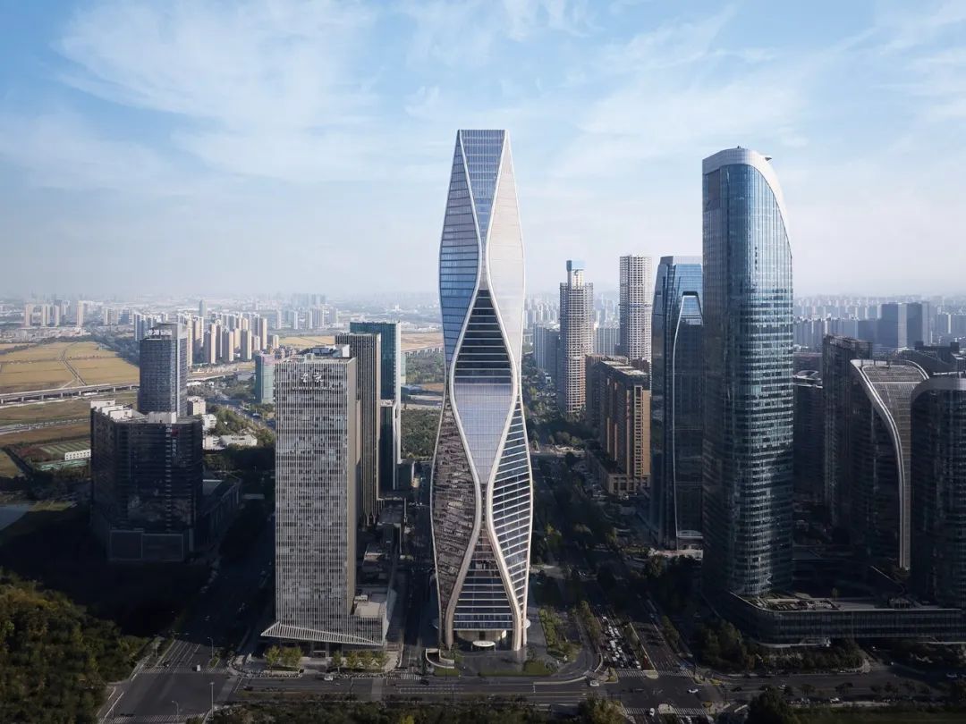 12.5 萬平方米的塔樓,造型獨特,沿著脈動的曲線向著云端升騰,讓人聯(lián)想到錢塘江漣漪的波紋。
