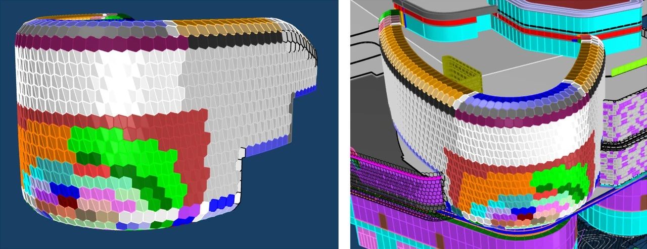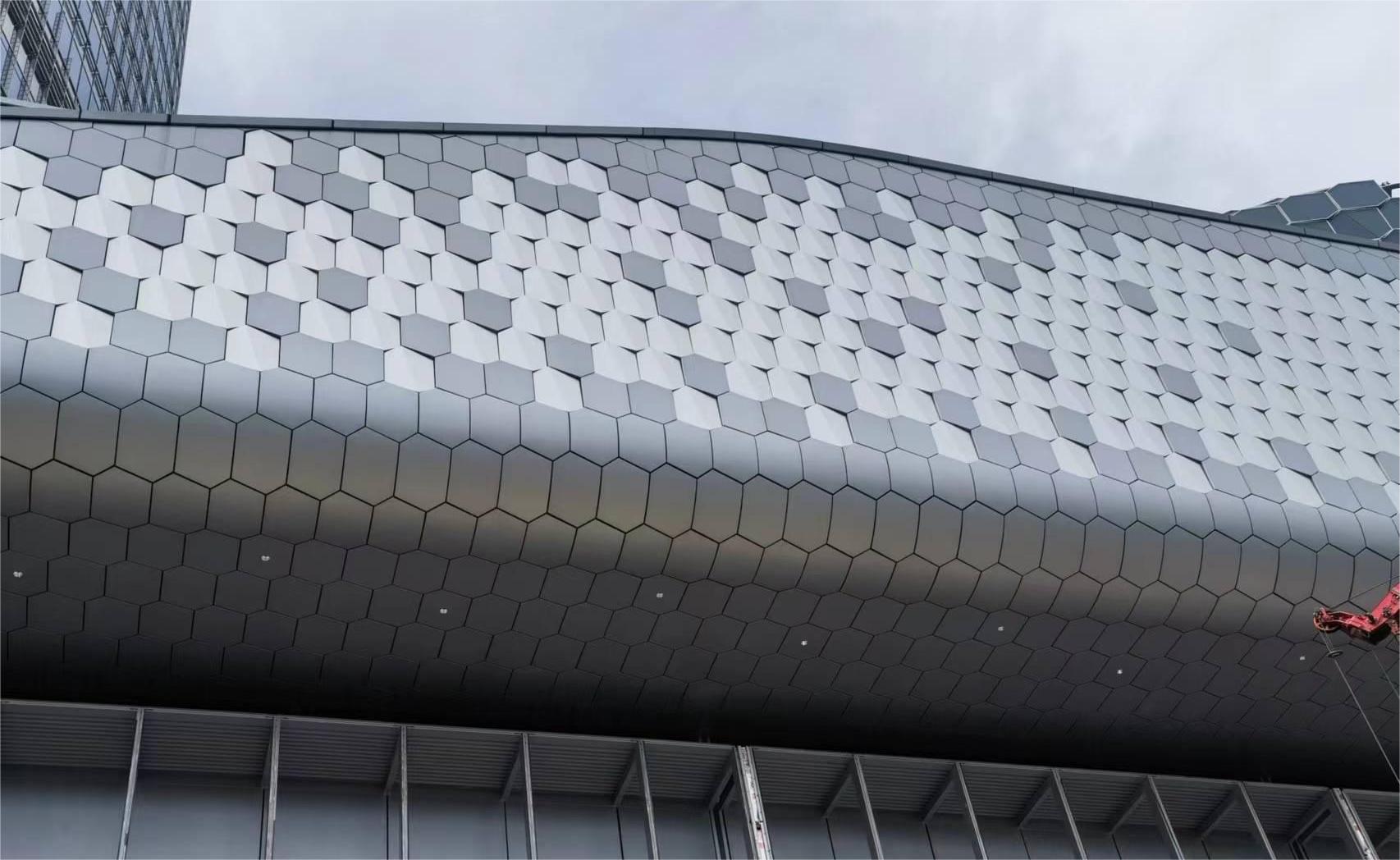 南裙樓船頭造型內(nèi)部鋼結構均有扭轉,要求拐角幕墻呈現(xiàn)雙曲面效果;屋檐幕墻設計圍繞龍鱗造型,分解為單片“六邊形”元素展開,拐角弧度造型對鋁板制造及安裝工藝要求極高。